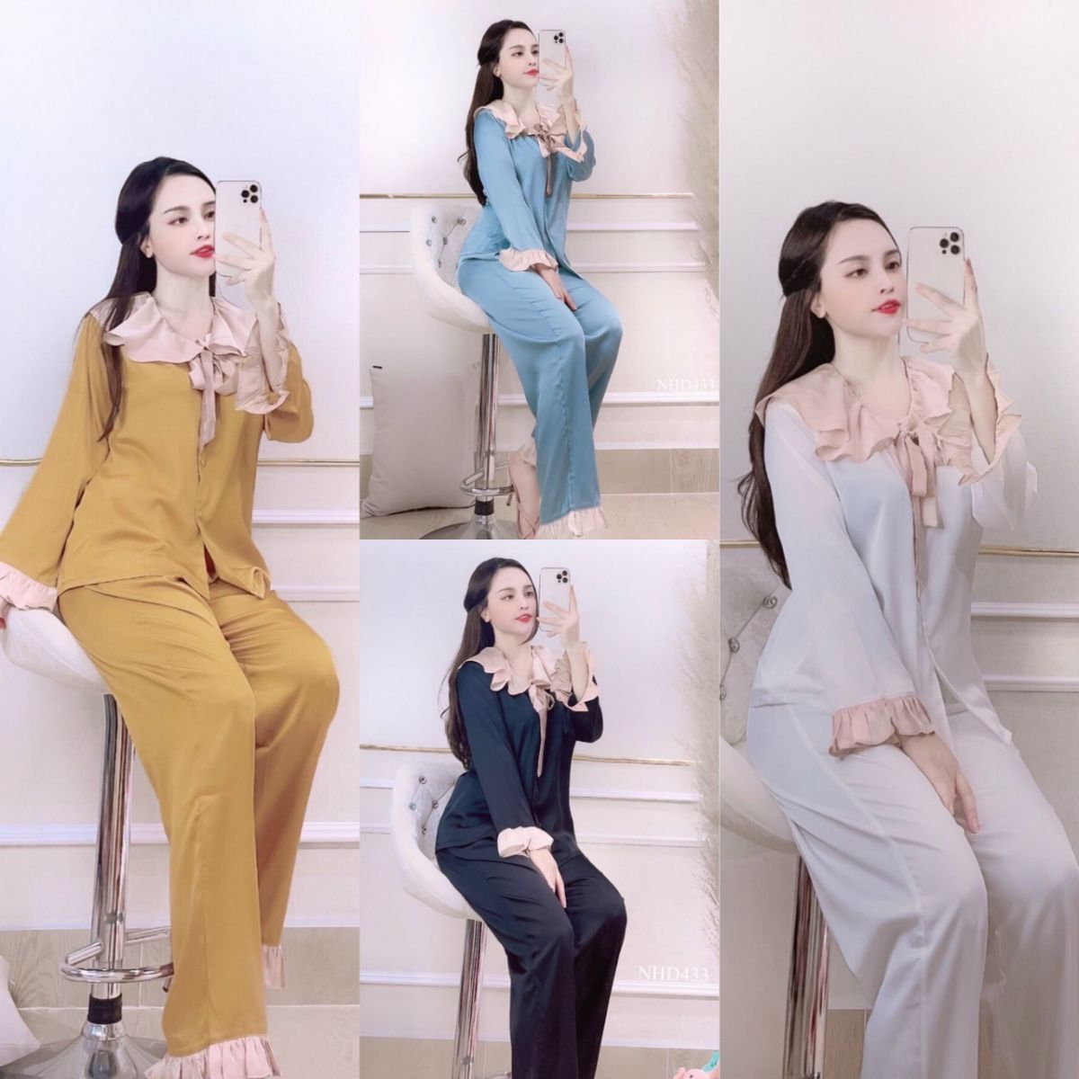 Set đồ bộ phi lụa dài cổ cánh sen thắt nơ